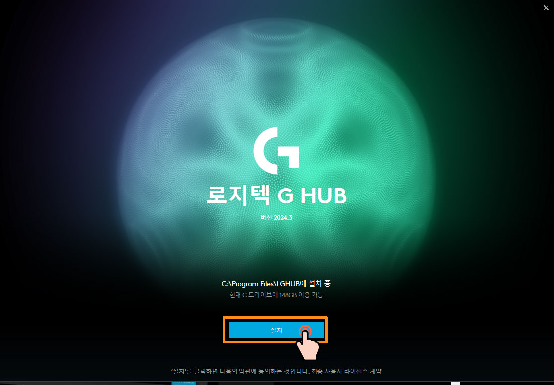 다운받은 로지텍 G-HUB 설치파일을 실행시키면 위와 같은 화면이 나옵니다.