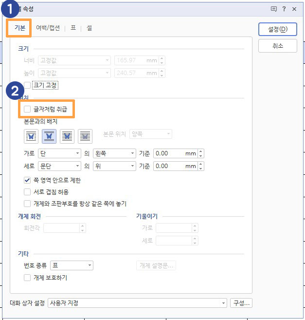 1번 기본탭에서 2번의 '글자처럼 취급'을 체크 해제한 상태로 두세요.