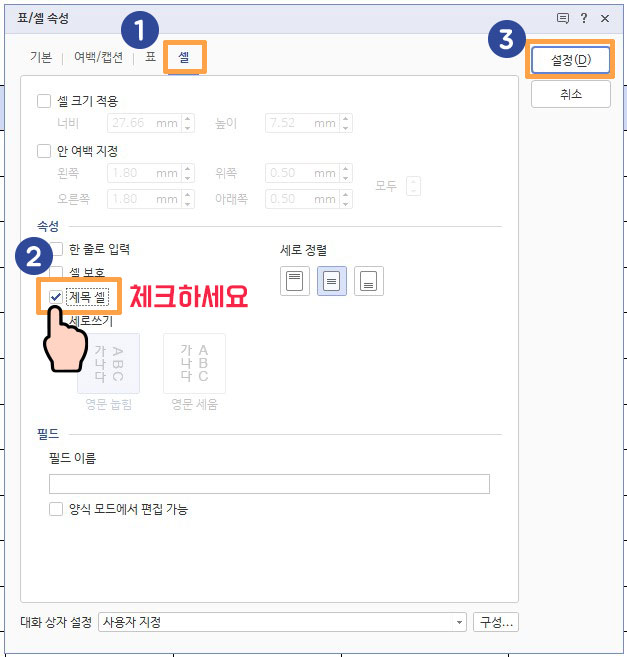 그리고 이번에는 셀 탭을 선택해주세요.