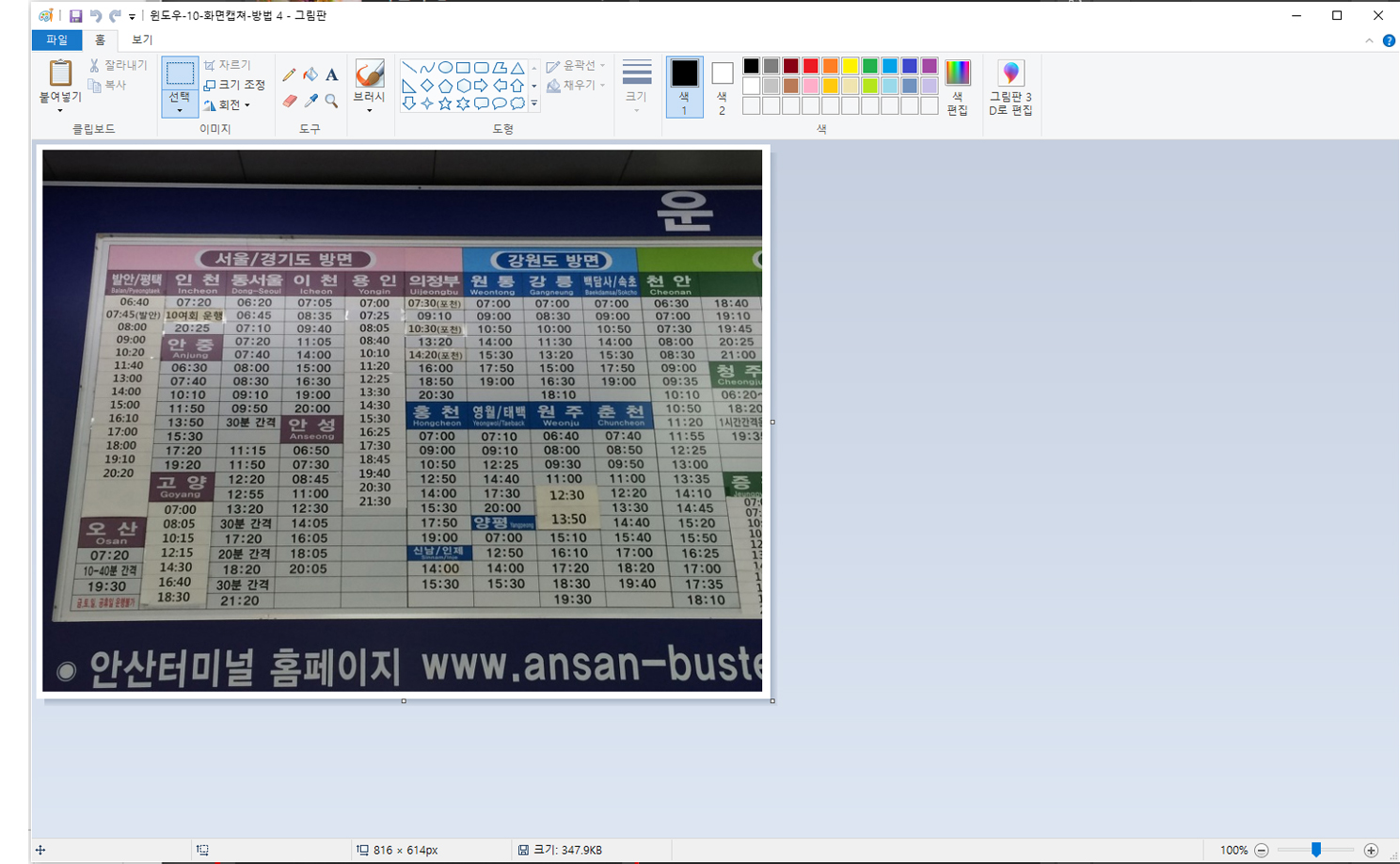 안산시 시외버스터미널 시간표를 캡쳐해봤습니다.