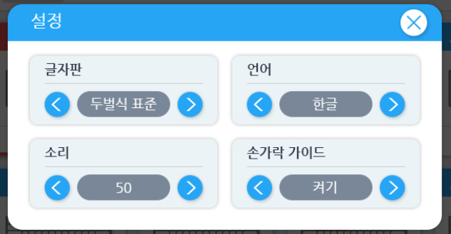 글자판, 언어, 소리, 손가락 가이드의 설정을 할 수 있네요.