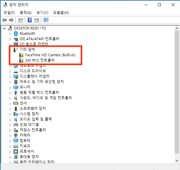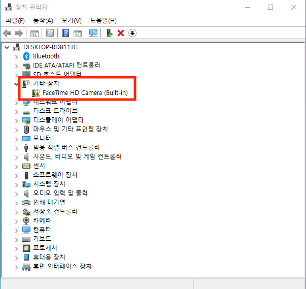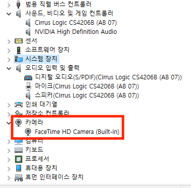 먼저 장치 관리자에서 보시면 위와 같이 페이스타임 카메라가 드라이버가