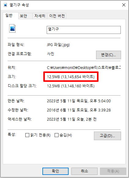 빨간색 네모 부분이 파일 크기를 나타내고 있네요.