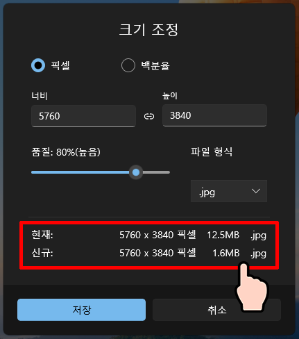 빨간 네모 부분에 현재파일 크기와 변경 될 파일의 크기가 미리 나오는데요.