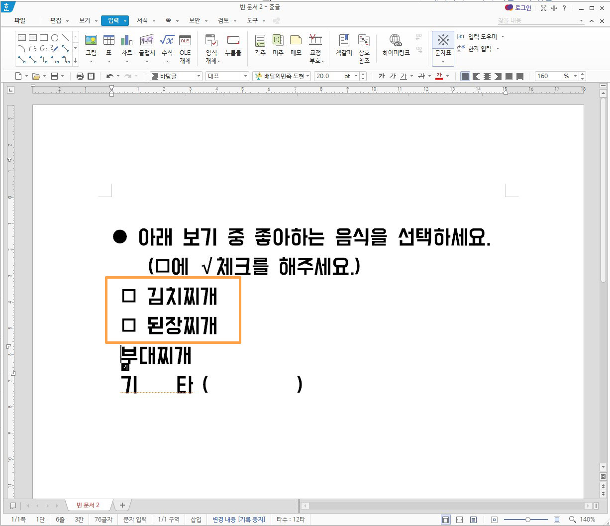 이때 한글파일의 커서를 체크표시 박스를 넣을 곳에 커서를 위치해주셔야 합니다.