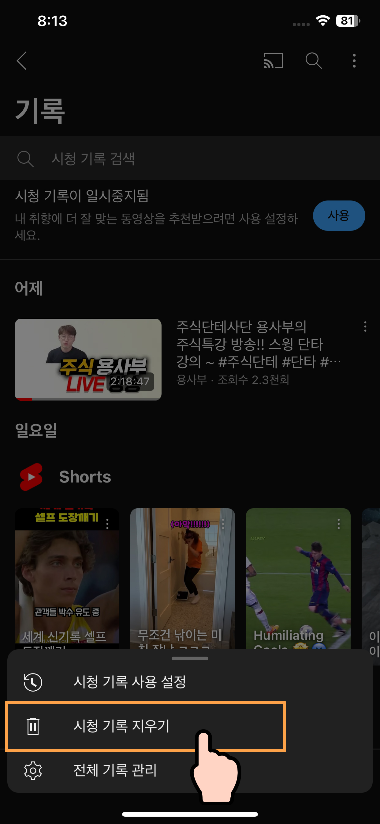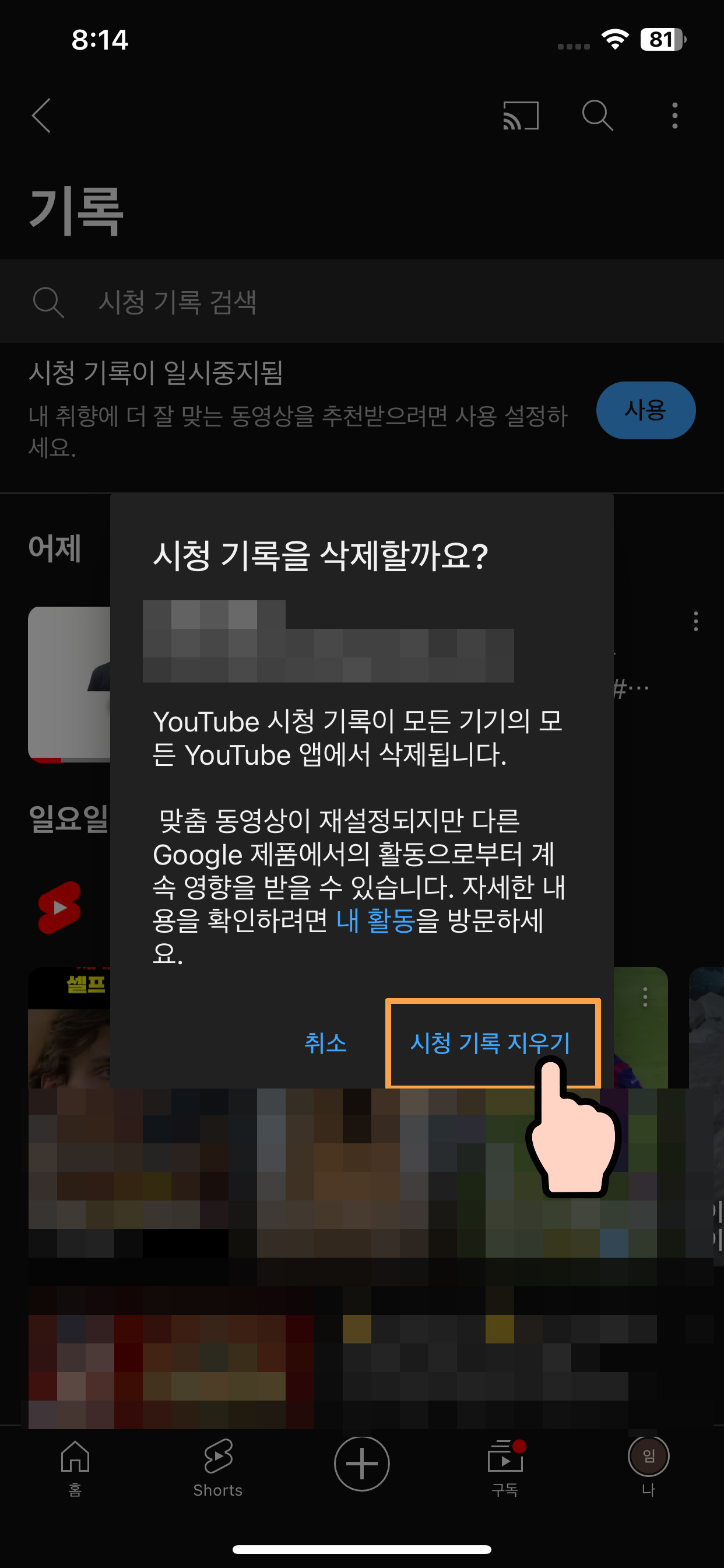 주황색 네모 부분의 시청기록 지우기를 터치해주세요.