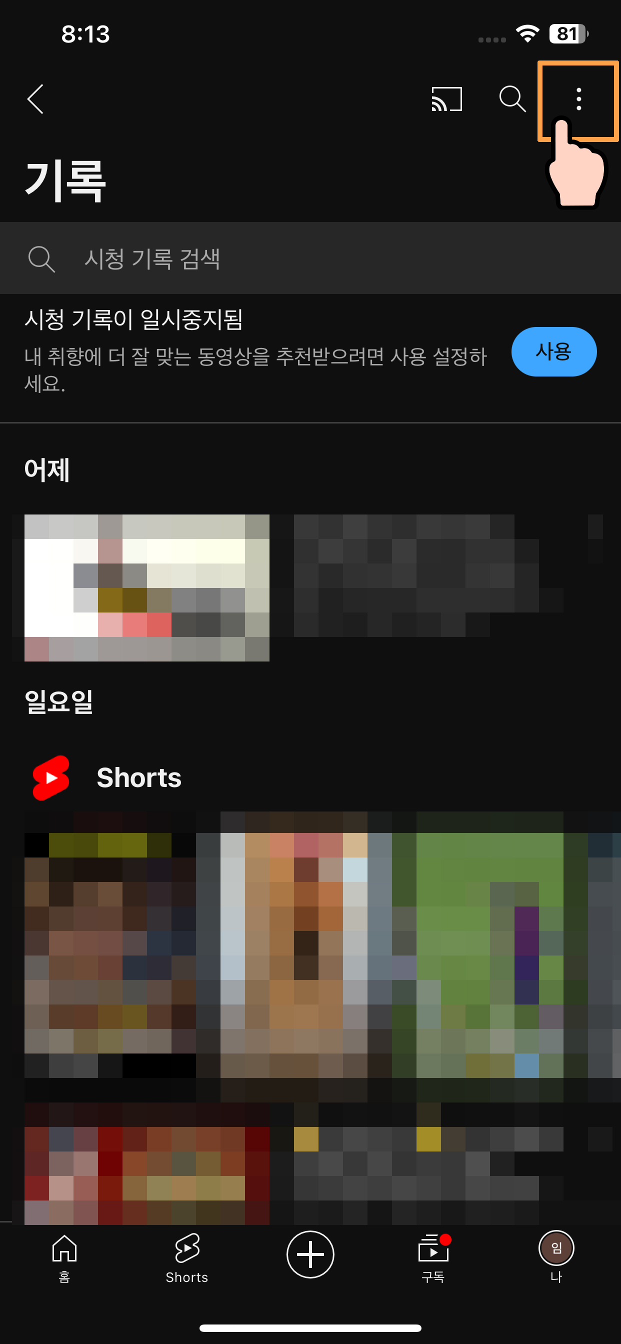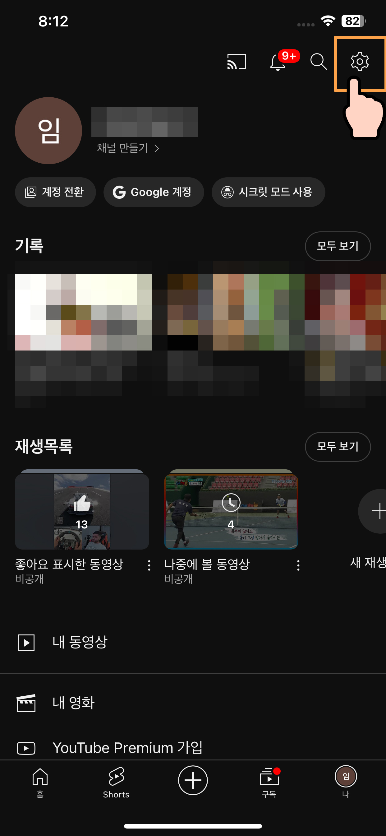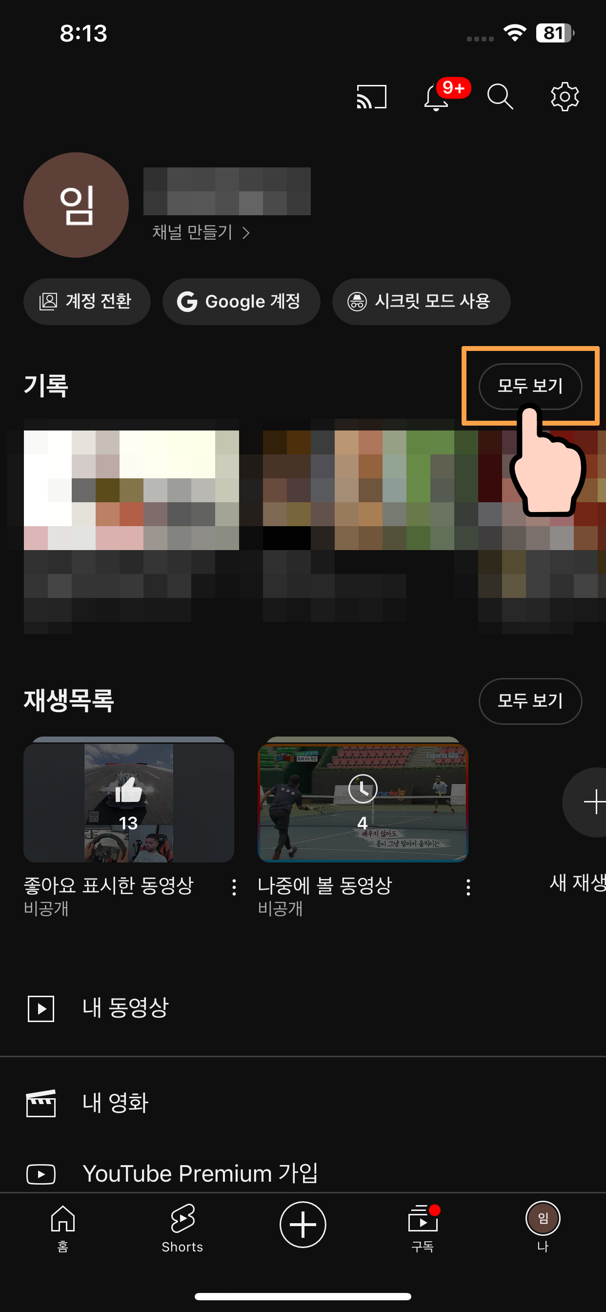 이번엔 유튜브 프로필 화면에서 재생기록을
