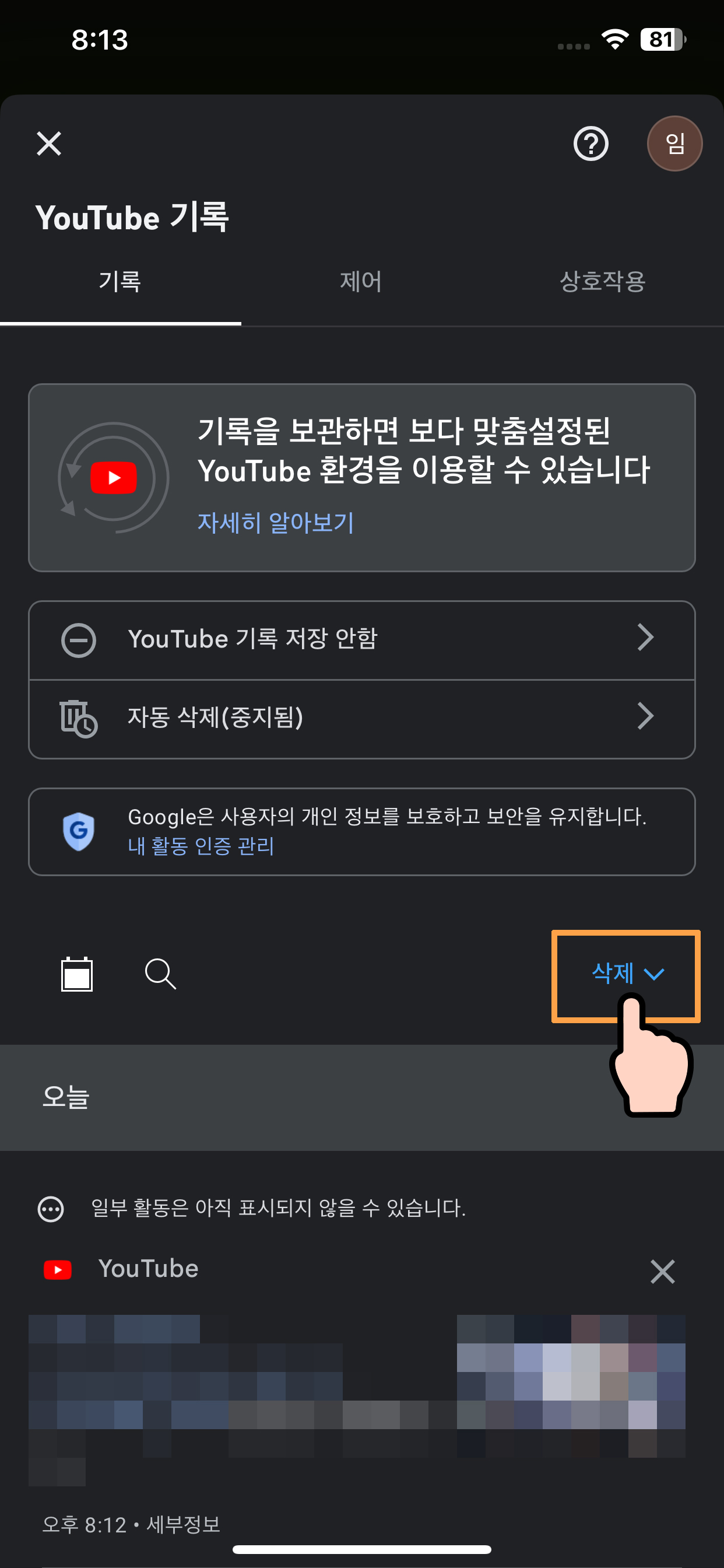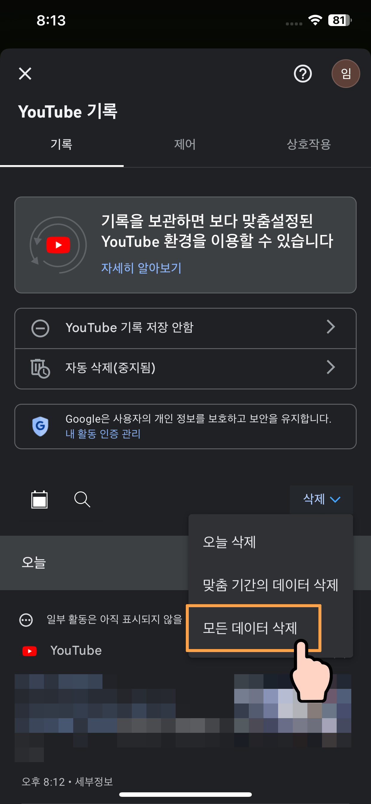기간을 설정해서 유튜브 기록 자동 삭제할 수 있는 설정을 할 수 있습니다.