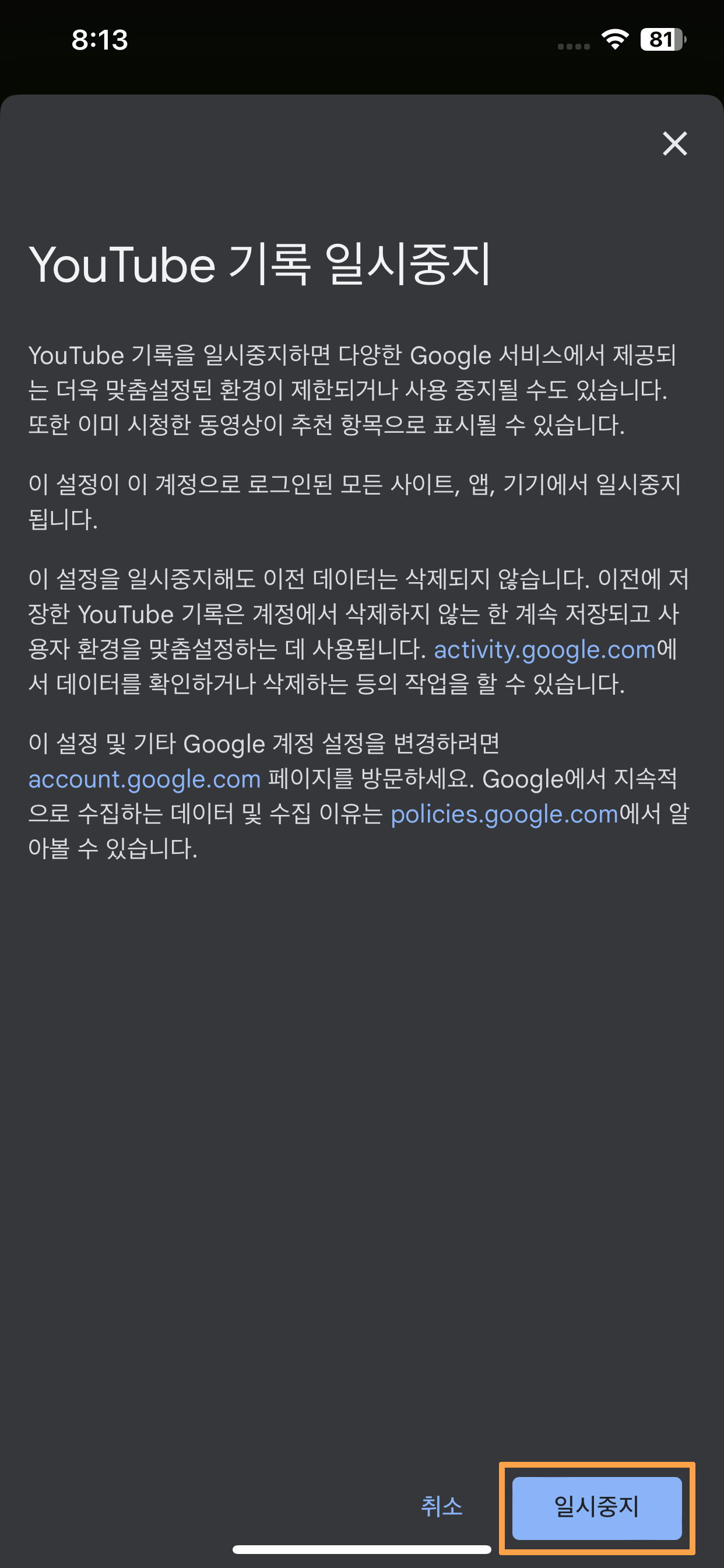 그럼 유튜브 재생 기록 중지가 꺼졌다고 나오네요.