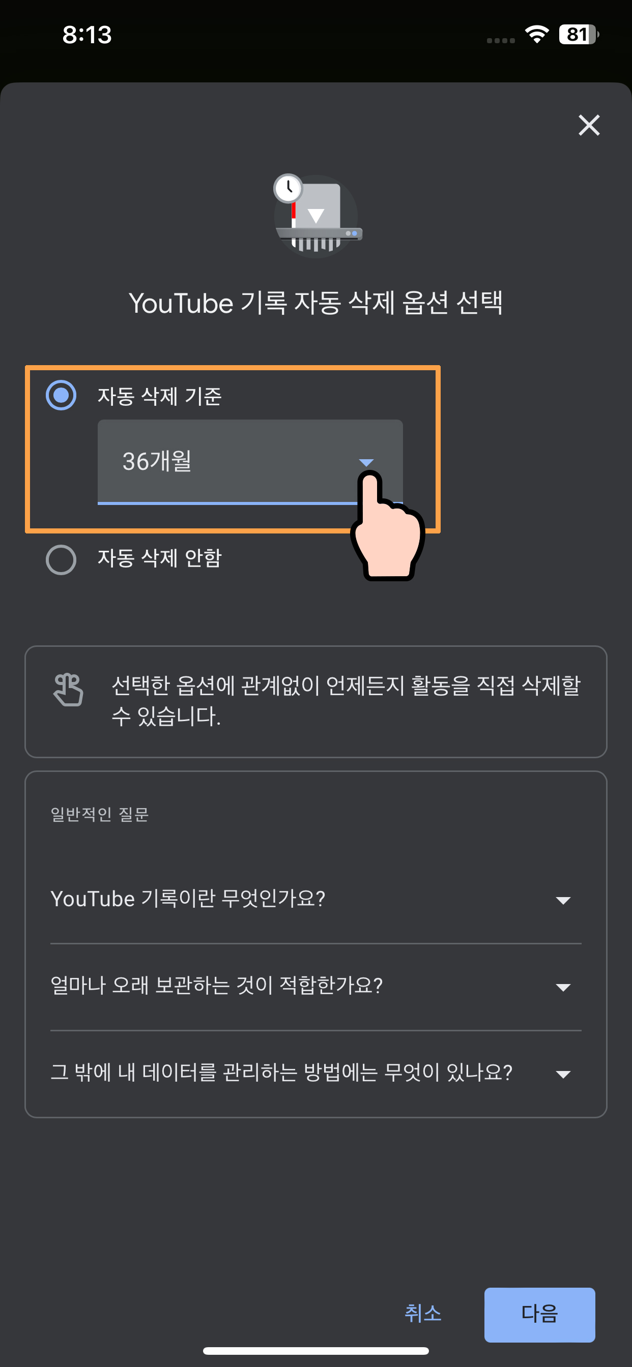 주황색 네모 부분을 보시면 자동삭제 기준의 36개월을 터치 해주세요.