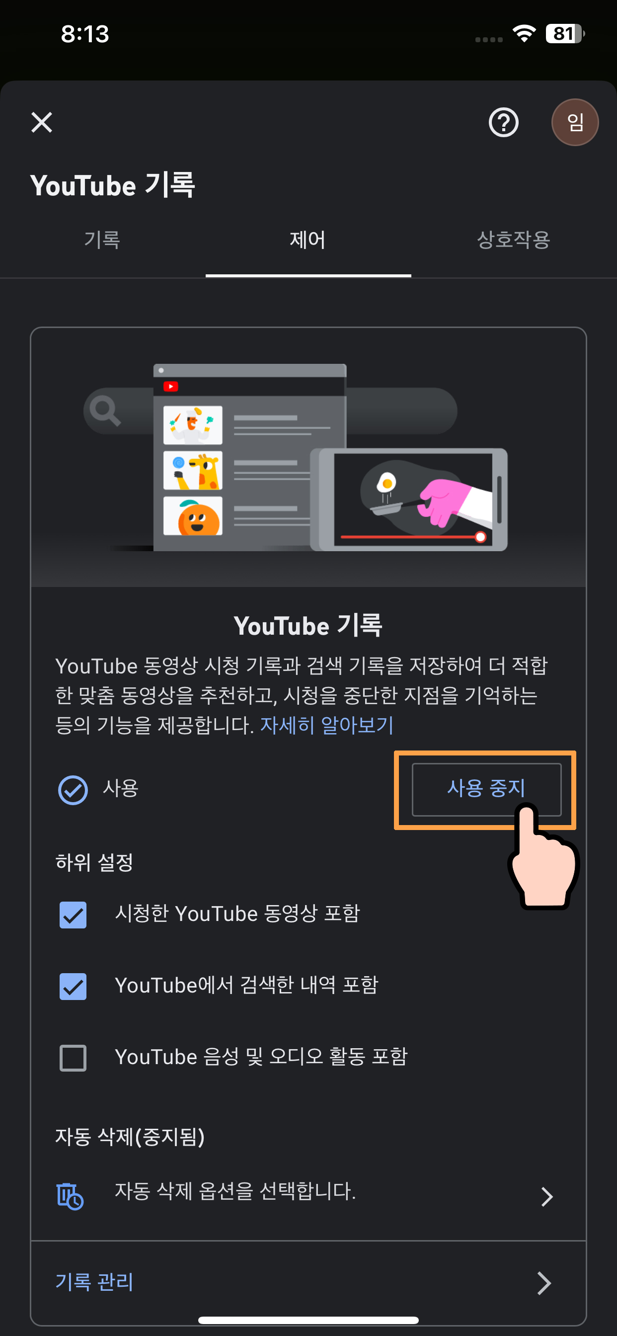 '유튜브 기록 저장 중'이라고 나온 부분을 터치해주세요.